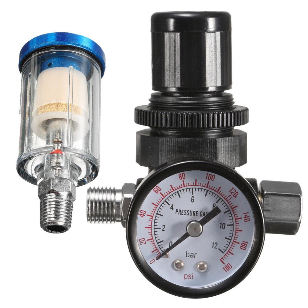 Removes moisture and impurities from air lines before it reaches the spray gun or air tool High flow design minimizes pressure drop to spray guns making it ideal for HVLPs. 14 Mini Air Spray Paint Gun Regulator Gauge Oil Water Separator Filter Trap US. - Fully adjustable and fits directly on to any conventional HVLP or LVLP gravity feed or suction feed spray gun - Regulate and set the correct pressure required when spraying - Suitable for use with other air tools that require an accurate pressure to operate Package.